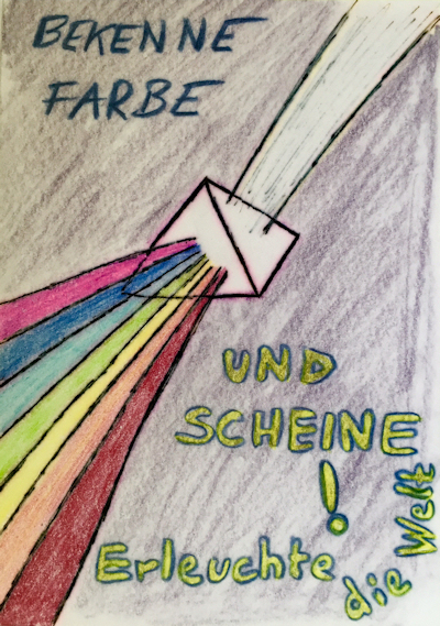 Bekenne Farbe und scheine! Erleuchte die Welt Erinnere Dich an Deine Absicht in diesem Leben, verbinde Dich mit Deinem Lebensplan. Diese Einweihung unterstützt Dich dabei. Was für den Einen gut ist, kann für den Anderen Gift sein. Sei Du selbst, handle aus Deinem inneren Gefühl heraus, und wähle was für Dich gut ist. Jede Farbe entstammt aus demselben weissen Licht, jede Farbe ist an und für sich perfekt und hat ihre Funktion. Sei die Farbe die Du bist und gebe der Welt Deinen persönlichen Farbtupfer dazu. Es gibt keine falsche Farbe, höchstens zwei Farbtöne die nicht besonders zueinander passen. Dennoch sind alle auf ihre Art perfekt. |